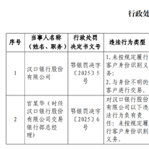 汉口银行被罚123万元:未按规定履行客户身份识别义务 与身份不明的客户进行交易