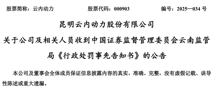 2025年7月8日,公司及杨波先生(现任董事长、总经理,时任董事长)、代云辉女士(时任董事、总经理)、宋国富先生(时任董事、总经理)、屠建国先生(时任董事、副总经理、财务总监)、王洪亮先生(现任董事,时任董事、副总经理)、朱国友先生(现任财务总监,时任财务管理部部长)、张永齐先生(现任公司营销公司副总经理、无人智驾事业部经理)收到中国证券监督管理委员会云南监管局(以下简称“云南证监局”)出具的《行政处罚事先告知书》(〔2025〕2号),现将具体情况公告如下: