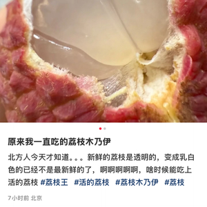 随着电视剧《长安的荔枝》爆火,今年荔枝实打实成为了水果中的“顶流”。7月10日,有广东网友发文称,她发现新采摘的荔枝果肉呈现透明光泽,而在家冻了3天的荔枝果肉则是乳白色。不少北方网友在评论区表示,她们还没看到过透明果肉的荔枝,原来他们一直吃的是荔枝“木乃伊”。
