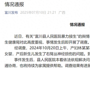 近日,据媒体报道,有网友反映广西富川县人民医院“暴力接生”,“暴力牵拉婴儿头部,导致婴儿右手神经断裂,失去自主功能”,引发关注。