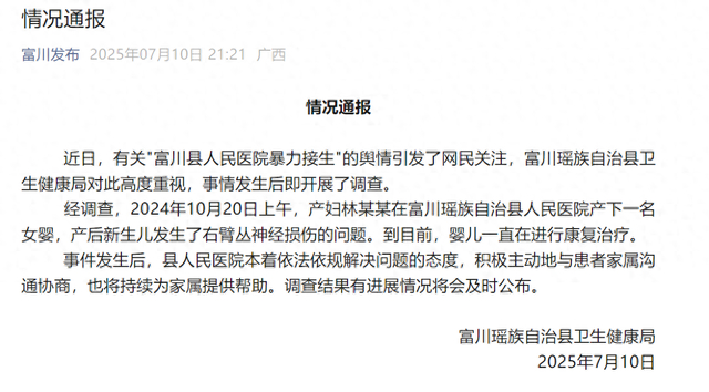 7月10日下午,富川县委宣传部工作人员回应@中国新闻周刊,医院及卫健局正在处理此事,伤情鉴定有待专业机构认定。对于是否存在“暴力接生”,尚无定论,需等待后续调查。