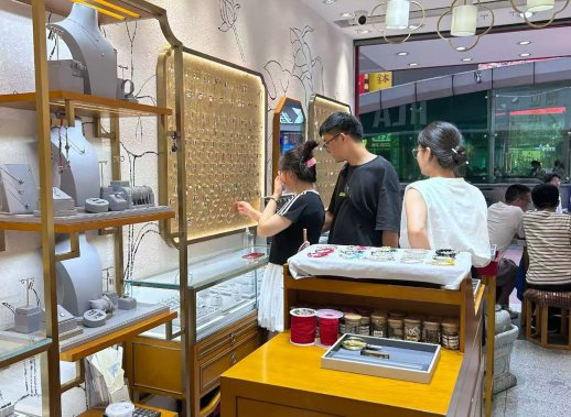 7月10日,记者来到天心区黄兴路的“银世之家”,店外有手工匠人现场制作,敲打声响彻街道。店内不少顾客在挑选银饰,店员正热情帮顾客挑选和佩戴饰品。相隔一条街的太平街区内,也分布有多家银饰店,其中一家“匠铸”门店内,有师傅正在现场雕刻银饰产品,吸引不少游客驻足观摩。