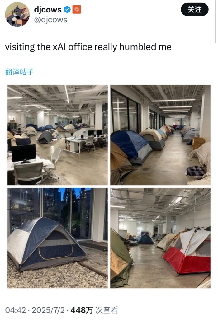 从这次迟到看,发布显得有些仓促,不过从性能测试看没有让行业失望。xAI整个团队为这次Grok 4的发布熬了不少夜,此前有博主访问了xAI的办公室,画面显示办公区走廊两侧全是帐篷,这意味着不少核心员工近段时间可能都睡在办公室。
