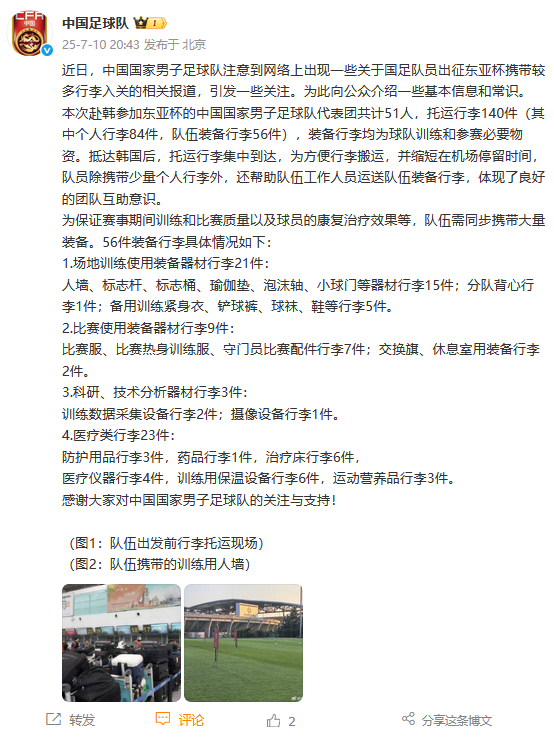 7月10日晚, @中国足球队 发布消息,近日,中国国家男子足球队注意到网络上出现一些关于国足队员出征东亚杯携带较多行李入关的相关报道,引发一些关注。为此向公众介绍一些基本信息和常识。