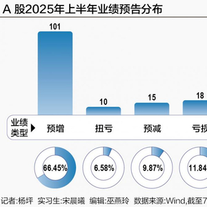 截至7月9日晚间,Wind数据显示,已有152家A股公司发布2025年半年度业绩预告。其中业绩预增企业101家,扭亏企业10家,合计占比73.03%;业绩预减企业15家,亏损企业18家,合计占比21.71%。另有4家企业业绩不确定。