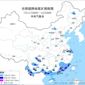 预计,7月11日08时至12日08时,福建东部沿海和南部、广东中南部、广西中南部、海南岛北部、台湾岛南部、云南中南部、四川盆地南部、江西南部、湖南南部、江苏南部、浙江北部、上海、内蒙古中部、黑龙江中部等地部分地区有大到暴雨,其中,广东东北部、福建东南部等地部分地区有大暴雨(100~150毫米)。上述部分地区伴有短时强降水(最大小时降雨量20~50毫米,局地可超过80毫米),局地有雷暴大风等强对流天气(见图1)。中央气象台7月11日06时发布暴雨蓝色预警。