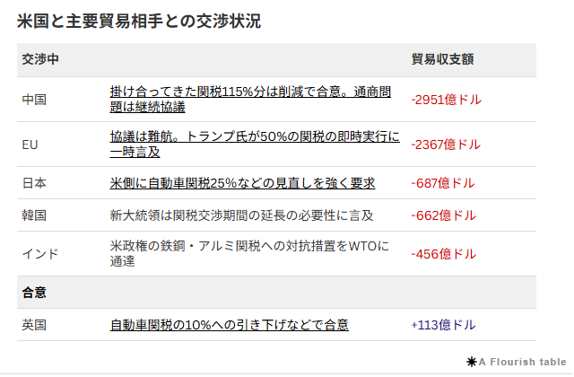 美国的贸易赤字中,中国为2951亿美元、欧盟2367亿美元,日本、韩国及印度分别为687亿美元、662亿美元、456亿美元。
