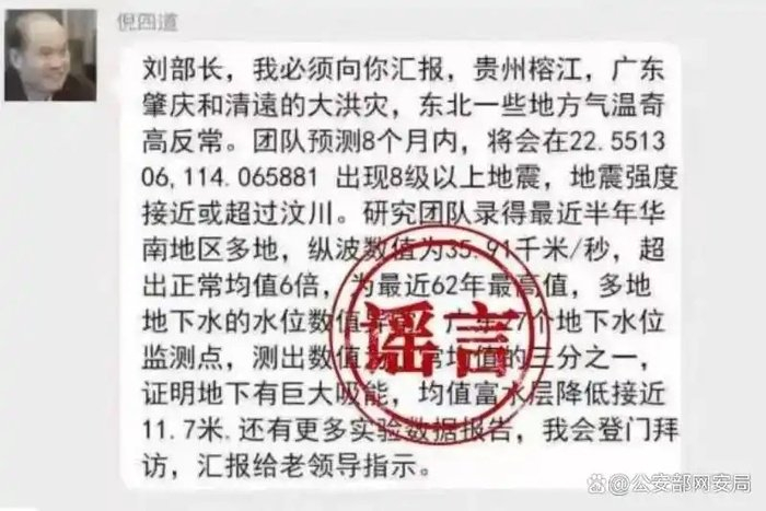 2025年7月11日,公安部网安局微信公众号通报,近日一张“院士预测广东将发生8级以上大地震”的截图在网络上传播,引发大量网民关注讨论。