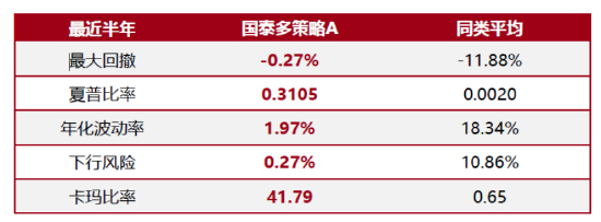 作为一只以绝对收益策略为主的混合型产品,国泰多策略收益混合在风控和回撤控制上下足功夫,历史风险控制指标表现十分优异,最近半年的最大回撤、夏普比率(代表风险调整后的收益)、年化波动率、下行风险、卡玛比率等指标,均显著优于同类基金平均水平。