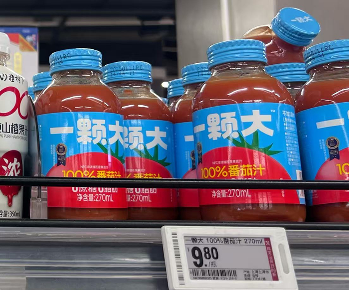 界面新闻在市场上看到,除了常规的生鲜蔬菜和调味料,番茄制品也扩充到了饮料领域,番茄汁的入局品牌不乏统一、胖东来等等,以及农夫山泉旗下的农夫果园也在去年将20年前的老款番茄汁“复活”。