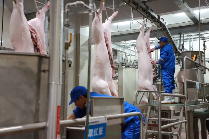 在现代化屠宰车间,各自动化工序环环相扣,井然有序。从宰前检疫、击晕放血,到剖解劈半、去毛取腺,一线员工操作娴熟、分工明确,严把每一道工艺关,全流程按照标准化要求进行,确保肉品质量安全、源头可控。