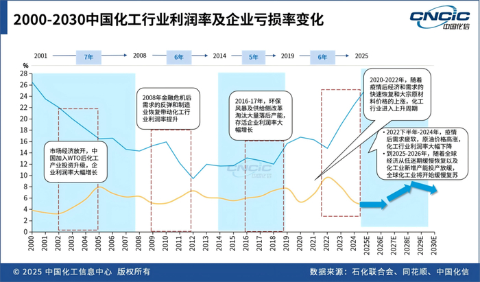 中国化工行业的景气周期通常为5~7年,主要影响因素包括全球宏观环境、原材料(原油为主)价格波动、政策调控等。2022—2025年,中国化工行业正经历本世纪以来第四轮周期的下行阶段。预计2025—2026年,行业仍处下行尾声,新能源材料(如光伏胶膜、锂电池化学品)有望率先复苏。而到2027—2028年,随着全球经济从低迷期缓慢恢复以及化工业新增产能投产放缓,全球化工业将开始缓慢复苏,预计2028—2029年化工业将进入反弹周期。未来2~3年,大部分化工企业仍将面临盈利挑战,但头部企业在新能源和高附加值领域的布局将带来新增长点。