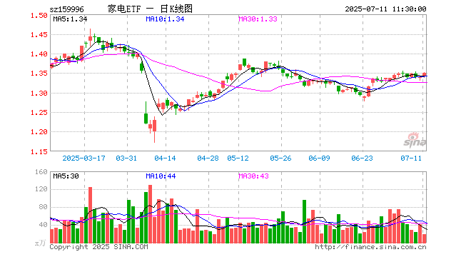 家电ETF(159996)业绩比较基准为中证全指家用电器指数收益率,管理人为国泰基金管理有限公司,基金经理为苗梦羽,成立(2020-02-27)以来回报为33.79%,近一个月回报为1.23%。