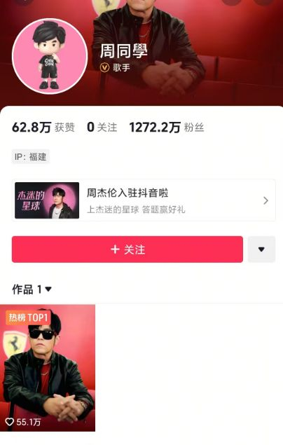 周杰伦新号“周同學” 更新首个作品,IP地址为福建,粉丝数已超1272万,概念股直线拉升