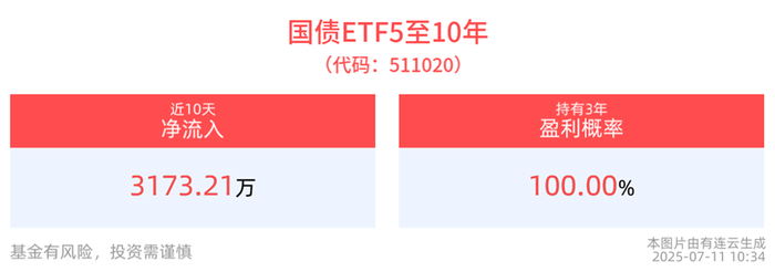 流动性方面,国债ETF5至10年盘中换手0.42%,成交631.07万元。拉长时间看,截至7月10日,国债ETF5至10年近1周日均成交7.93亿元。