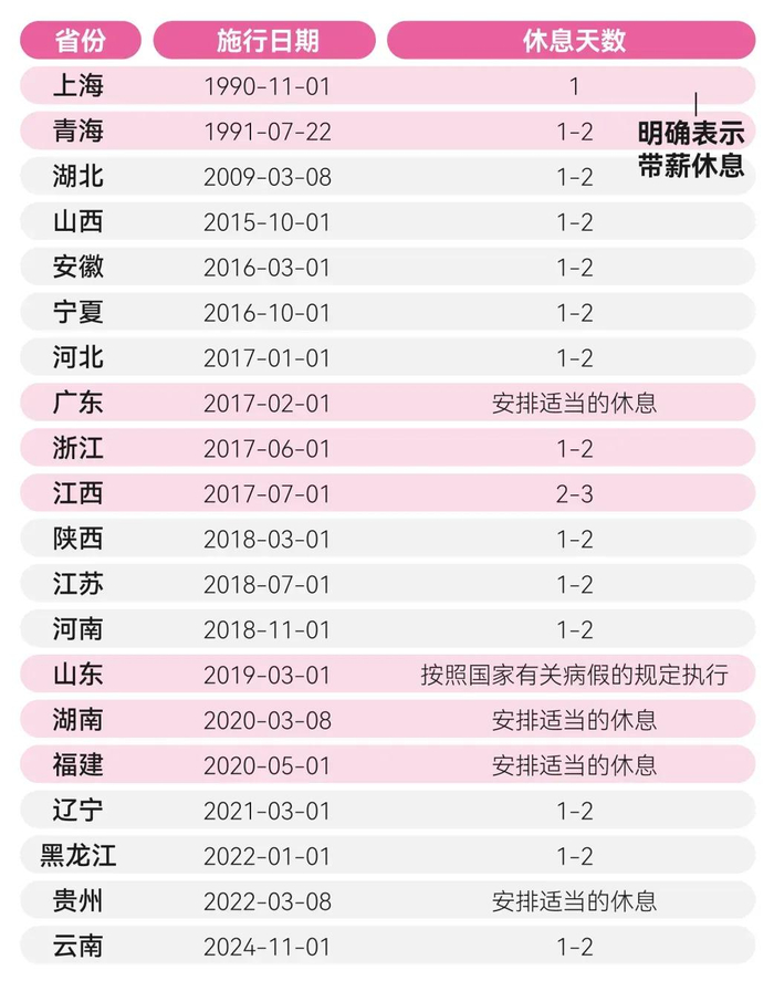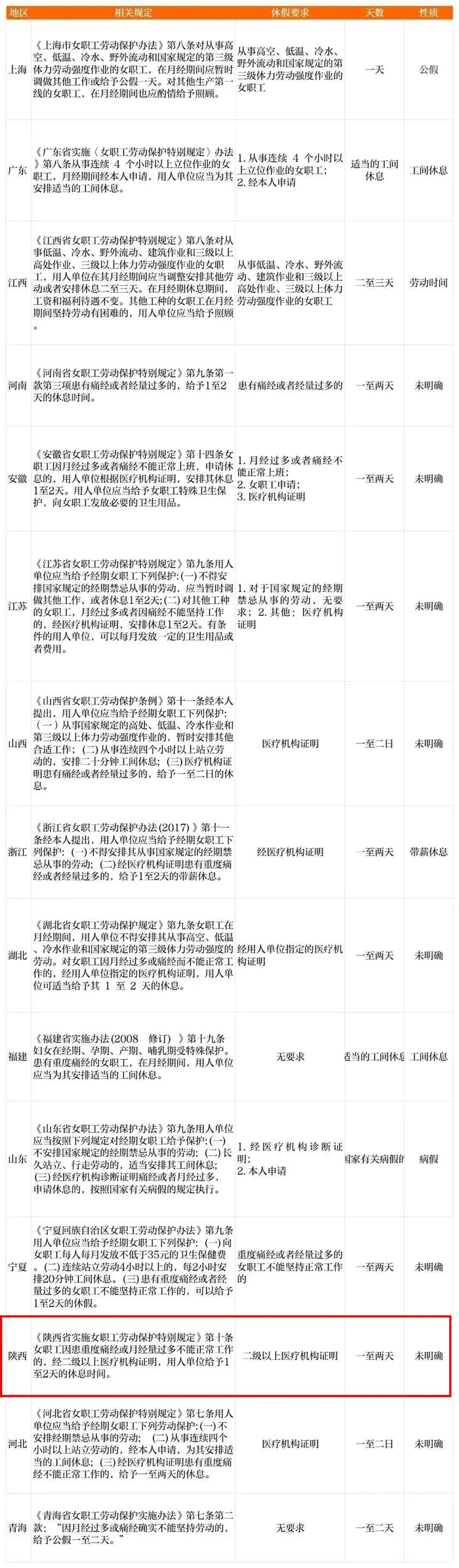 据不完全统计,目前,全国已有包括北京、上海、山东、广东、浙江、云南等约20个省市,在地方性规定中明确了女性劳动者的这一权益,休息时间普遍在1~2天,最多的是3天。
