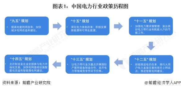 电力是国家社会经济发展不可或缺的公共事业之一。在“九五”规划中,电力的发展方向是提高电能利用效率、加快城乡电网改造和建设;“十五”规划提出要深化电力体制改革、积极发展新能源和可再生能源;“十一五”规划要求加强电力需求侧管理和电力节能工作;“十二五”规划则是在“十一五”规划的要求上进一步提出推进电价改革和智能电网建设;“十三五”规划重点提出要开展电力等行业的国际合作、放开电力竞争性环节价格;“十四五”规划则是允许制造业企业全部参与电力市场化交易、加快智能电网建设。