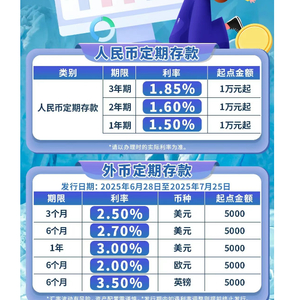 据上述文章介绍,江苏银行上海分行于6月28日—7月25日发行外币定期存款,其中美元、欧元、英镑起点金额据均为5000。1年期美元定存利率为3%,6个月美元定存利率为2.70%,而英镑的利率最高,1年期定存为3.50%。
