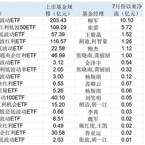 以银行股为代表的高股息红利资产受到资金的追捧。Wind数据显示,7月份以来,多只红利ETF资金呈现净流入的态势。其中,华泰柏瑞红利低波动ETF(512890.SH)7月份资金净流入10.1亿元,截至7月10日收盘,规模达到了203.43亿元;南方标普中国A股大盘红利低波50ETF(515450.SH)7月份以来净流入5.72亿元,最新规模达到了109.29亿元。
