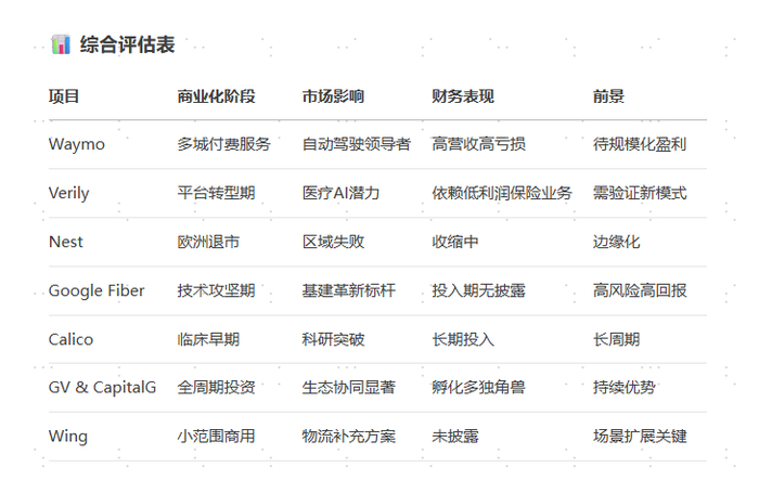 Alphabet。2009年信中提到很多科技领域发展缓慢核心是关注度不够,比如清洁能源如今投入是几年前的100倍,主要就是有了更多关注度。Google长期投资&寻找技术突破思路就是寻找当下技术发展缓慢,但是Google如果聚焦投入,能够显著加快进程的方向。2015年Google重组为Alphabet,Larry和Sergey改任集团董事长,专注于新业务。而Pichai就任Google CEO,负责Google核心业务。其背后思路可能借鉴了《创新者窘境》,由于此时Google主业已经十分庞大,新业务相对来说则规模小很多,处于同样组织架构用同样价值观来看,新业务吸引力是显著更小的。另一方面,新业务有单独组织架构,则能够摆脱这种组织阻力,而创始人聚焦Otherbets更是显示对新业务投资信心。2016年信中,Larry盘点了一下Otherbets,这些包括自动驾驶Waymo,生命科学的Verily Life和Calico,智能家居Nest,通信基础设施GoogleFiber,Google两大投资部门CapitalG和GV,无人机配送Wing。现如今看这些项目发展如何?我让DeepSeek整理一下这些项目进展,整体来看Waymo算不错的,Nest已经基本失败,AI制药有一定进展,其他项目目前看仍然不确定,可见创新不确定性很强。