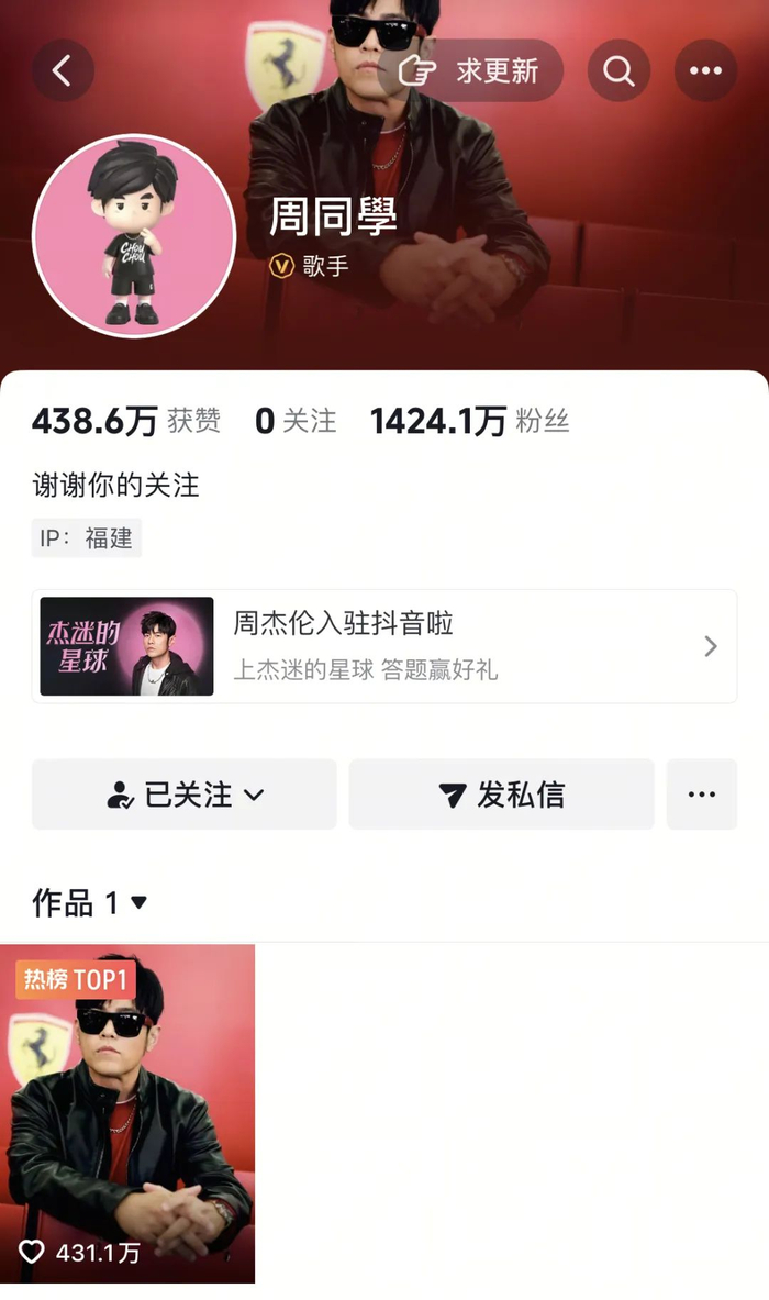周杰伦新号“周同學” 更新首个作品,IP地址为福建,粉丝数已超1424万,概念股直线拉升