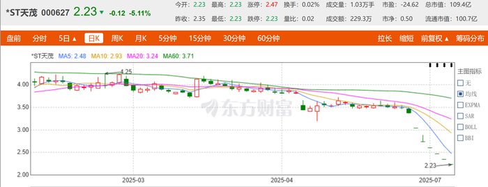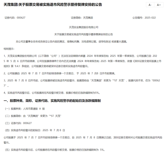 天茂集团称,公司股票将自2025年7月7日开市起继续停牌一个交易日,于2025年7月8日开市起复牌,股票简称由“天茂集团”变更为“*ST天茂”,股票代码不变,仍为“000627”。实施退市风险警示后,公司股票将在风险警示板交易,股票价格的日涨跌幅限制为5%。