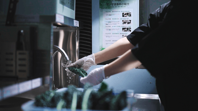 在主打“鲜嫩”的蔬菜领域,最为关键的就是解决绿叶菜的农残和锁鲜问题。书亦本次甘蓝皱叶菜原料全部采用合作基地直供,定级标准明确,品质要求严苛。每日现摘的菜叶在经过 质检、打包等环节,再通过冷链物流高效送达门店,全程标准化可溯源。同时,门店侧书亦也制定了严格的清洗和备料标准,每一片皱叶甘蓝都要在门店再次经过冲洗、消毒、清洗、分切四道工序,才能与消费者见面,充分保障每杯饮品入口的健康与安全。