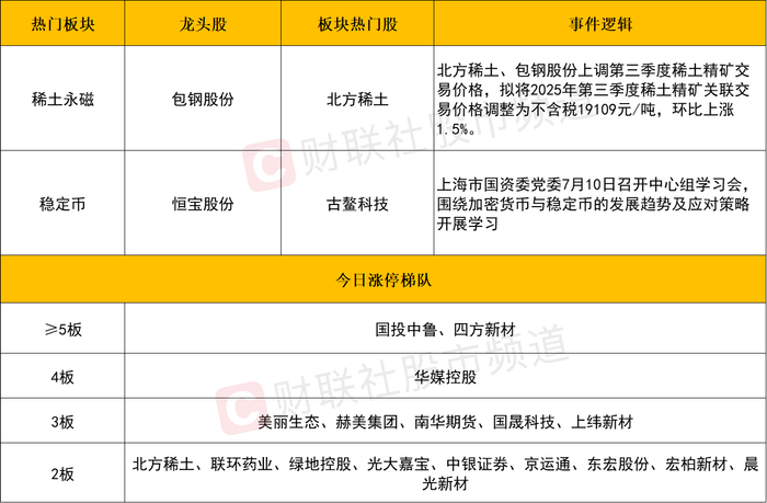 板块上,稀土永磁全天领涨,北方稀土、包钢股份、华宏科技、中国稀土、盛和资源、三川智慧、久吾高科、中色股份等涨停。消息面上,北方稀土、包钢股份上调第三季度稀土精矿交易价格,拟将2025年第三季度稀土精矿关联交易价格调整为不含税19109元/吨,环比上涨1.5%。