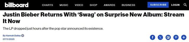 就在刚才,比伯发行了他的第7张录音室专辑《Swag》(Swag是来源于嘻哈文化的网络流行语,意为“酷”“潮”,是比伯青少年时期最爱使用的词之一)。