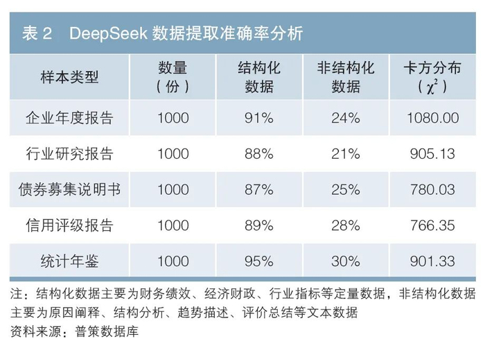 在提取与处理非结构化数据时,如企业经营情况的描述性文本、行业报告和新闻资讯等内容,DeepSeek的表现相对有限。由于此类数据缺乏统一的格式和结构,DeepSeek在提取关键信息时可能存在较大偏差,部分关键数据或结论的准确性仍需人工复核。如在处理企业经营情况时,DeepSeek无法准确识别隐藏在冗长文本中的关键信息或市场趋势。同样,在解析行业报告和新闻资讯时,可能会遗漏某些重要信息或误判其含义。我们选取普策数据库中的信用评级相关资料1进行数据提取测试,准确率2结果分析见表2。该表显示DeepSeek在提取结构化数据和非结构化数据时存在显著差异。因此,在使用DeepSeek处理非结构化数据时,仍需结合人工审核,以确保最终结果的准确性。