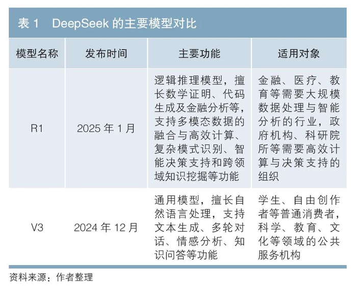 DeepSeek发布的各个模型在设计目标、训练方法、应用场景和性能表现等方面具有较大差异,其中最为成熟与广泛应用的主要是DeepSeek-V3和DeepSeek-R1模型。DeepSeek-V3模型专注于自然语言处理、知识问答、内容创作等通用任务,目标是实现高性能与低成本的平衡,适用于智能客服、个性化推荐系统等场景。DeepSeek-R1模型专为数学、代码生成和复杂逻辑推理等任务设计,适用于大规模数据处理、高效计算及智能分析等场景。DeepSeek-V3和DeepSeek-R1模型分别代表了通用任务处理能力与垂直领域推理能力的极致优化(见表1)。