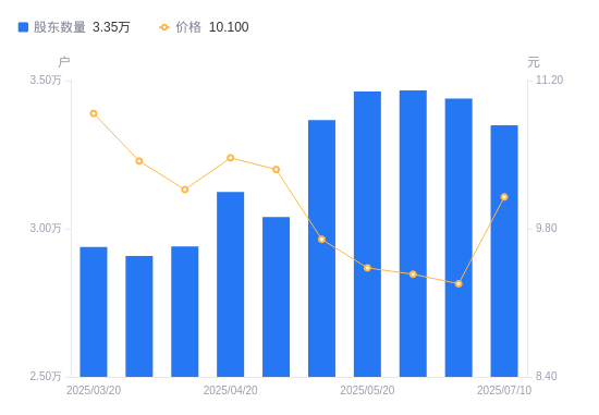 近一年(2024年8月10日至2025年7月10日),滨江集团A股股东户数从4.13万户,减低至3.35万户,降幅18.88%,区间股价上涨18.96%。