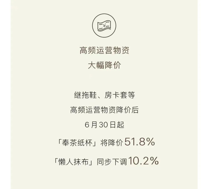 其实早在今年上半年,亚朵就做过类似的事,如成人拖鞋、房卡套这些常用品平均降了10%,承诺供应链物资售价不高于同级别友商,摆明了是要在供应链上精打细算。