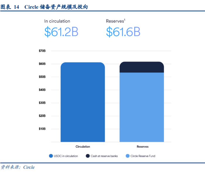 稳定币资产管理方的主要职责是依法合规地管理储备资产。以Circle 为例,USDC 储备资产616 亿美元中,约86%的储备资产投向Circle Reserve Fund,基金由贝莱德管理且Circle 是唯一持有人,年管理费率为0.16%。通过贝莱德专业资产管理能力提升储备金收益效率,每日更新公布投资组合,助力USDC 加深市场信任。
