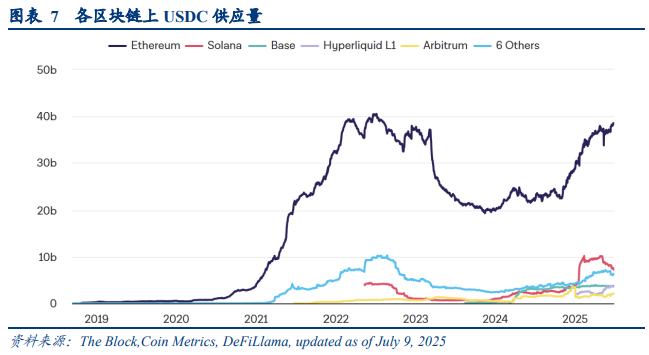 稳定币依托区块链技术发行,同时在功能特性上较好地平衡了开放性与稳定性。当前主流稳定币主要部署在以太坊、波场(TRON)、Solana 等公链之上,每条链因交易成本、速度、安全性差异承载不同的资金与优势使用场景。(1)USDT 最初基于比特币的 Omni 协议发行,后逐步转向以太坊和 Tron。目前,Tron 已成为提供 USDT 最大的网络,链上 USDT 流通量占比 50.6%。TRON 与 USDT 实现较强绑定,生态相互依赖。TRC20-USDT 广泛应用于跨境支付、场外交易等场景,尤其在金融基础设施不足的新兴市场,成为当地用户进入数字经济的重要入口。(2)USDC 于 2018 年在以太坊主网上线,已在 23 条区块链网络上得到原生支持。目前,以太坊仍是USDC 最大供应网络和主要流通链。(3)如何实现资产跨链?除了原生多链部署之外,稳定币也可以通过跨链协议或桥接机制在各链间实现流通。