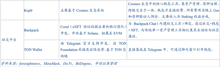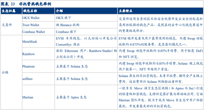 非托管热钱包的盈利模式多元化,广泛嵌入加密货币生态各主要环节。以MetaMask为例,其在Swap(加密货币兑换服务,通过自动对接去中心化交易所获取最优价格)中收取约 0.875%服务费;基于Solana生态的Phantom也对Swap收取0.85%服务费,其主要目的之一是服务生态与推动区块链用户增长。Trust Wallet、OKX Wallet、Coinbase Wallet 等与交易所具有绑定关系的钱包盈利主要依赖DEX返佣、Staking合作分成、法币入口通道佣金、平台导流等方式,而非直接向用户收取转账或账户费用。其他基于公链推出的钱包如Martian、Ultimate等,其收入来源为Staking抽成与少量生态激励等。所有链上操作的Gas Fee均由用户支付给区块链网络的矿工/验证者。