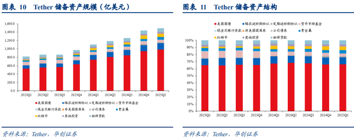 Tether储备资产高度多元化。截至2025年3月31日,Tether储备资产总额达1492.7亿美元(较年初+4%)。从储备资产构成看,现金及现金等价物和其他短期存款占比81.5%,其他资产类别合计占比18.5%(含公司债券、贵金属、比特币等价值波动较大的资产)。细分来看,现金及现金等价物方面,美国国债占主导(占储备资产总额比例66.0%,下同),其次为隔夜逆回购协议(10.1%)、货币市场基金(4.2%)等。其它资产类别中,包括担保贷款(5.9%)、比特币(5.1%)、贵金属(4.5%)、其他投资(3.0%)等。
