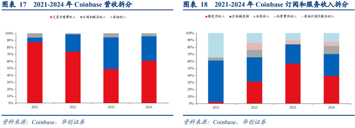 从商业模式来看,以上市的Coinbase交易所为例,Coinbase为客户提供围绕加密货币的一系列服务,包括交易、质押、存储、管理、借贷和使用加密资产等。2024年,Coinbase收入中,交易手续费收入(Trading Fees)占比61%,是Coinbase营收中最大组成部分。订阅和服务收入(Subscription & Services)占比35%,其中,主要包括区块验证与质押、稳定币利息分成、利息收入、托管服务收入等,分别占收入比31%/39%/12%/6%。2023年起,来源于稳定币的收入大幅增长,主要由于USDC规模上升以及美联储加息导致来自Circle的分成增加。