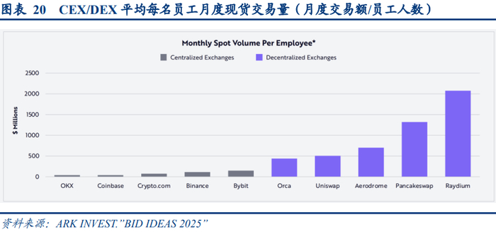 去中心化交易所(DEX)是在区块链基础上运行的、无需中心化中介的资产交易平台。过去几年Defi(去中心化金融)蓬勃发展,DEX是生态重要参与者之一。DEX允许用户使用智能合约直接相互交易并保持资金控制权,交易直接在区块链上执行。同时,不对用户进行 KYC(用户信息)的认证,目前也不受到监管机构的直接约束。尽管如此,DEX 的规则设计、协议开发与运维仍由特定团队主导,相关机制需依托公链网络进行部署与执行。在实际运营中,如Uniswap、Aerodrome 和Raydium等代表性DEX 项目,凭借高度精简的团队结构与自动化机制,实现了远高于中心化交易所(CEX)的运营效率,其团队规模通常为CEX的十分之一,但依然能支撑复杂的链上流动性市场。