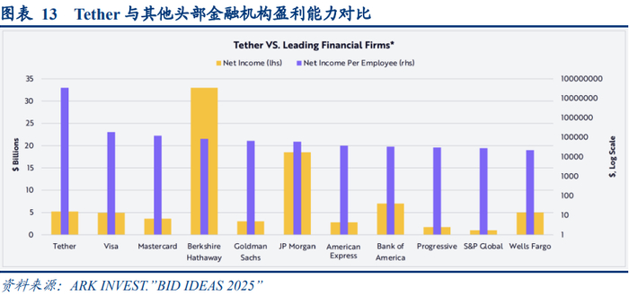 成本端,根据ARK的报告,Tether员工人数仅不到200人,而JP Morgan和Berkshire Hathaway员工数量均超过30万人;2024年上半年,在标普金融精选行业指数中,仅有Berkshire Hathaway、JP Morgan、BOA和Wells Fargo的净收入超过 Tether。