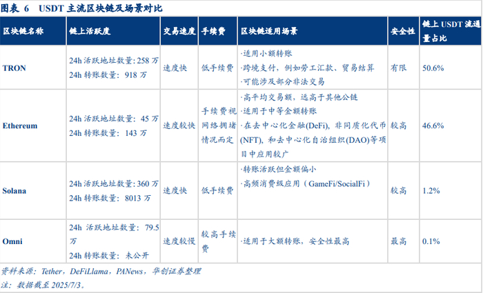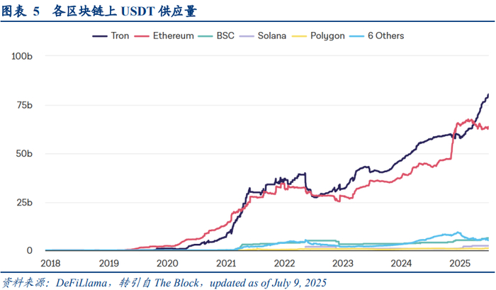 TRON已正式超越以太坊,成为提供USDT最大的网络。TRON通过前期的手续费补贴、激励措施及后续的能量租赁模式逐渐成为USDT发行及流通的第一大网络。截至2025/7/3,根据USDT的透明度数据,就实际流通量而言,Tron上USDT实际流通量800.6亿美元,占比50.6%;以太坊实际流通量737.3亿美元,占比46.6%;Solana实际流通量18.3亿美元,占比1.2%。