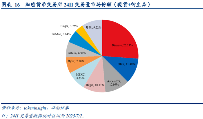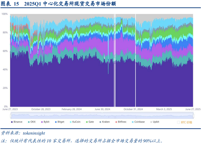 中心化交易所(CEX)是最常见的类型,由一个管理交易平台的中央组织运营,用户通过交易所界面创建账户、存入资金和进行交易。从中心化交易所竞争格局来看,根据tokeninsight,2025Q1加密市场现货交易量高度集中,具有代表性的10家交易所(可以覆盖加密货币90%以上的交易量)中,Binance占据46.4%的市场份额,领跑市场。前七大交易所(Binance、Bybit、Coinbase、OKX、Gate、Upbit、Bitget)合计占94.7%的市场份额,已形成了“一超多强”的格局。