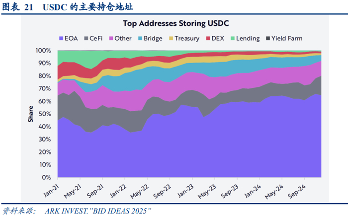 钱包有何重要性?加密货币钱包是一种设备或程序,支持加密货币存储、管理与转移。根据ARK的报告,以USDC的持仓地址为例,外部拥有账户(EOAs,包括链上由私钥控制的标准账户类型),即用于点对点(P2P)交易与资产存储的标准以太坊地址,目前占 USDC 使用量的60%,是生态链上重要参与者。其次,中心化交易所占比约11%,Layer2网络间的跨链桥占比7%,去中心化交易所(DEX)与加密借贷市场分别占比1.7%。