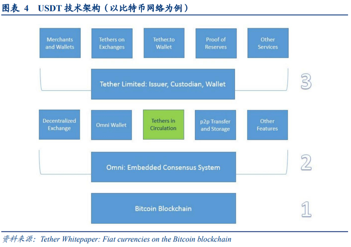 其技术架构主要分为三层:1)第一层是区块链主网,USDT的交易账簿通过 Omni层协议嵌入比特币区块链中;2)第二层是Omni层协议(Omni Layer Protocol),该协议主要是服务于比特币区块链,用于铸造、销毁、跟踪、交易和存储 USDT;3)第三层是Tether公司这一实体,主要负责USDT发行以及抵押资产的管理、审计等,运营USDT以实现其与区块链钱包/交易所/服务商等的对接。