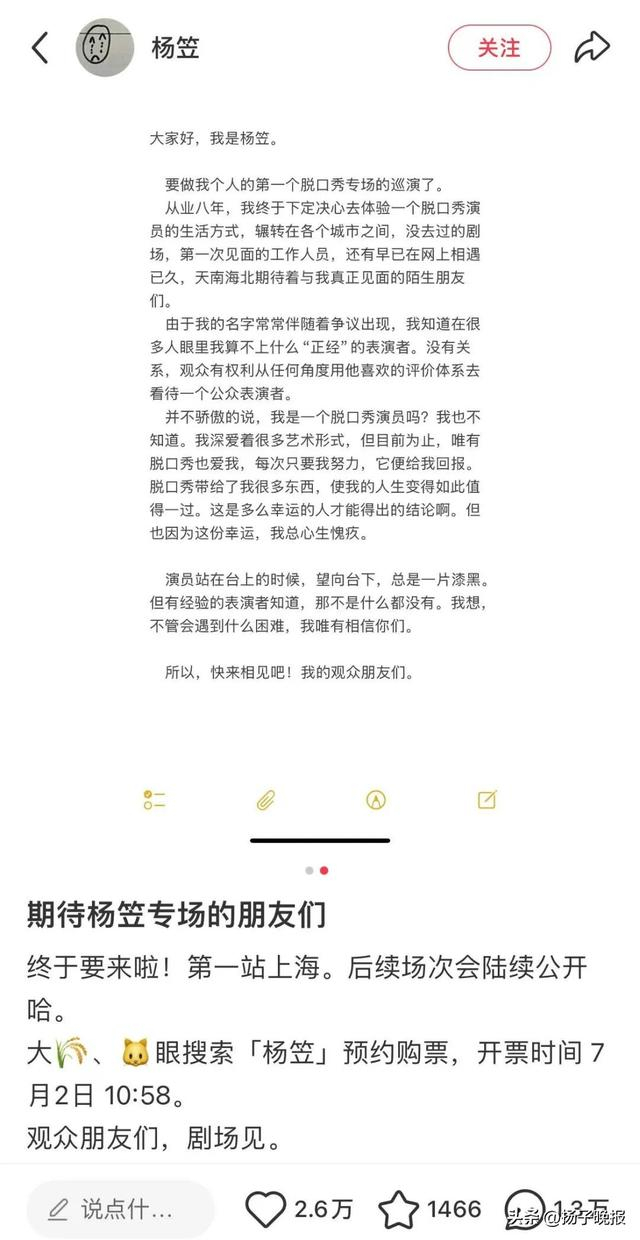 6月26日,杨笠宣布将开启个人的第一个脱口秀巡演。她提到从业以来的争议:“由于我的名字常常伴随着争议出现,我知道在很多人眼里我算不上什么‘正经’的表演者。没有关系,观众有权利从任何角度用他喜欢的评价体系去看待一个公众表演者。并不骄傲的说,我是一个脱口秀演员吗?我也不知道。我深爱着很多艺术形式,但目前为止,唯有脱口秀也爱我,每次只要我努力,它便给我回报。脱口秀带给了我很多东西,使我的人生变得如此值得一过。”