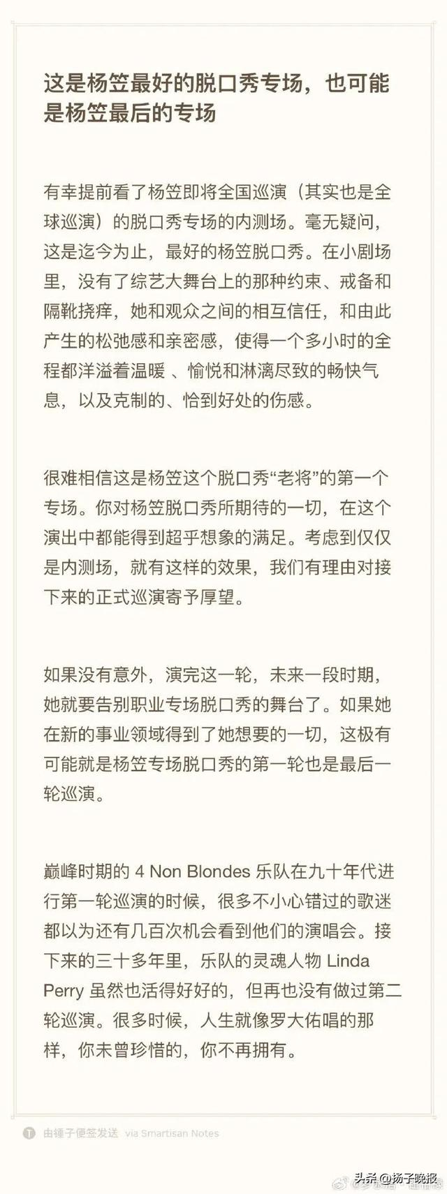 如果没有意外,演完这一轮,未来一段时期,她就要告别职业专场脱口秀的舞台了。如果她在新的事业领域得到了她想要的一切,这极有可能就是杨笠专场脱口秀的第一轮也是最后一轮巡演。