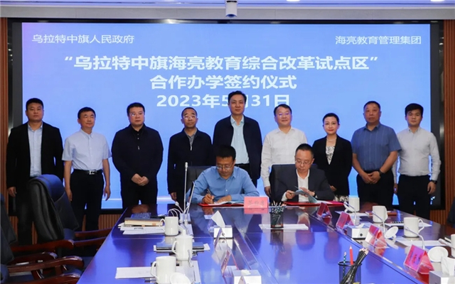 2023年5月,海亮教育管理集团与内蒙古自治区巴彦淖尔市乌拉特中旗人民政府达成合作,双方以成立“乌拉特中旗海亮教育综合改革试点区”的模式开展合作办学,以乌拉特中旗第一中学作为试点区核心校,乌拉特中旗第二中学作为成员校。海亮派驻管理团队在学校管理,教学教研、教师发展、学生成长、创新人才培养等方面开展共建共享,以试点区合作学校为引擎,带动全旗教育水平的整体提升。