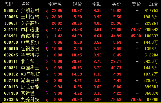 稀土板块盘中大幅飙升,截至收盘,奔朗新材30%涨停,创历史新高;中科磁业涨近15%,包钢股份、北方稀土、中国稀土等均涨停。