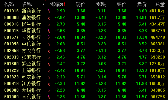 银行板块午后回落走低,截至收盘,浙商银行、浦发银行、民生银行等跌近3%,长沙银行、江苏银行、中国银行等跌逾2%。