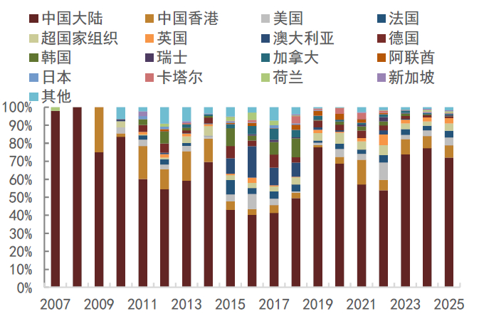从涉险国家来看[6],离岸人民币债券仍以中资企业为主。2024年,境内中资主体发行占比达到77%,中国香港、美国、法国、英国等区域的发行主体也在积极参与离岸人民币债券市场,2024年中国香港主体发行占比达到7%,美国、法国、英国等国家占比可以达到2%-3%。历史上来看,中资发行人始终为离岸人民币债券的主要发行力量,特别是近两年中资发行人占比进一步增加。不过2015年至2018年期间,离岸人民币债券发行量整体下滑,中资发行人占比降至50%以下,境外发行人比例反而有所抬升。离岸人民币存单几乎全部为有中资背景和金融机构所发行,境外主体占比较低。